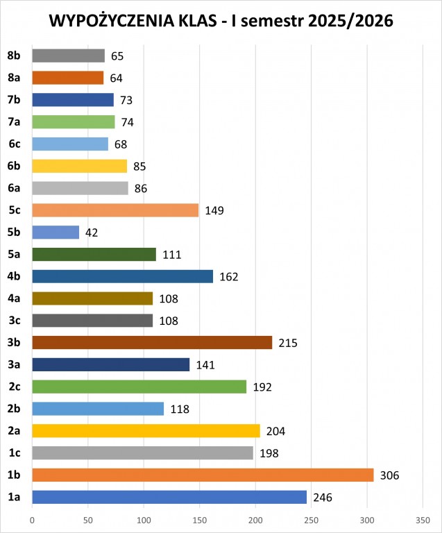 Podsumowaliśmy czytelnictwo w I semestrze roku szkolnego 2025/2026! Oczywiście mamy informacje dotyczące tylko wypożyczających w naszej bibliotece, a wiemy, że część osób ma bogate księgozbiory w domu lub korzysta z biblioteki publicznej (gratulacje! Czytanie to bardzo dobry krok w kierunku własnego rozwoju :)).